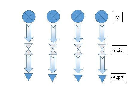 我們再來看一下這種一頭一泵的灌裝流程圖,同樣以四頭灌裝機(jī)為例: