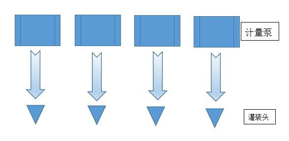從圖中我們可以看出該種方式去掉了流量計(jì)灌裝機(jī)的核心—流量計(jì),采用計(jì)量泵的灌裝方式,一個(gè)計(jì)量泵配合一個(gè)灌裝頭,那么這種方式是不是更好呢?